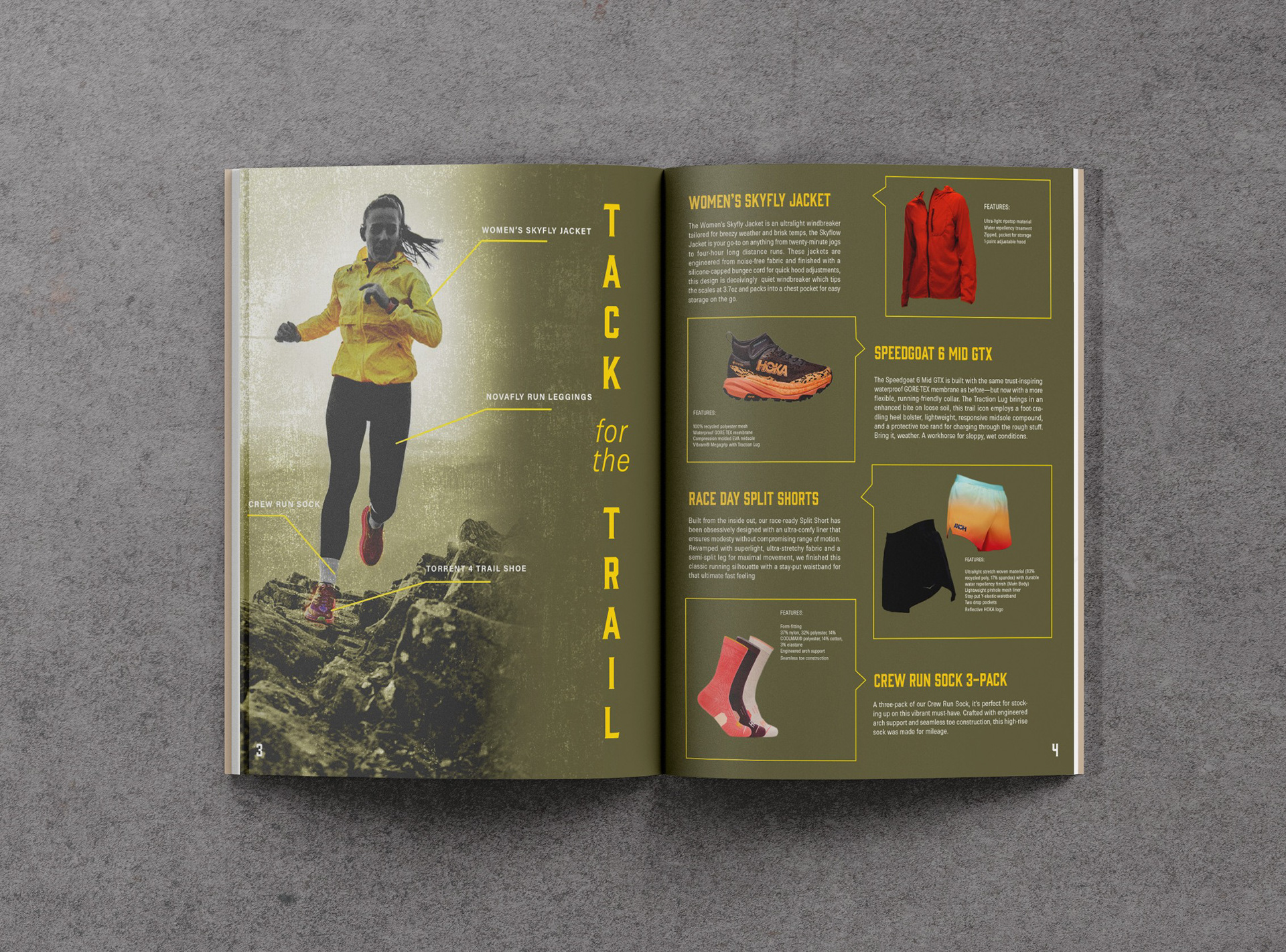 Process: Inspired by HOKA’s trail events and running clubs, I wanted to create a bold and empowering brochure that would motivate runners to join the HOKA Trail Running Group. The brochure highlights HOKA shoes and apparel, features potential trails to run with different difficulty levels, recommends different shoes, and encourages readers to join the HOKA Trailblazers. To achieve a rugged, energetic look, I edited stock photos in Photoshop with added texture, combining photos, and editing lighting. I brought the photos in and laid out the final design in InDesign using bright accents for a bold visual impact.